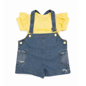 HERMOSO CONJUNTO PARA NIÑA BEBÉ QUE INCLUYE JARDINERA EN DENIM CON BORDADOS DE FRUTAS Y CAMISETA BÁSICA EN ALGODÓN SUAVE. PERFECTO PARA EL DÍA A DÍA CON UN TOQUE DULCE Y ENCANTADOR.