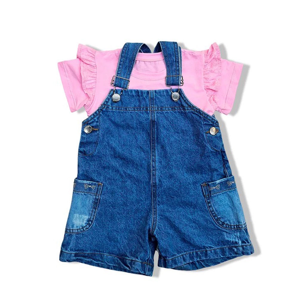 HERMOSO CONJUNTO PARA NIÑA BEBÉ QUE INCLUYE OVEROL CORTO EN DENIM CON BOLSILLOS DELANTEROS Y DETALLES DESGASTADOS, MÁS CAMISETA DE ALGODÓN CON MANGAS DE VOLANTES. PERFECTO PARA EL DÍA A DÍA CON ESTILO Y COMODIDAD.