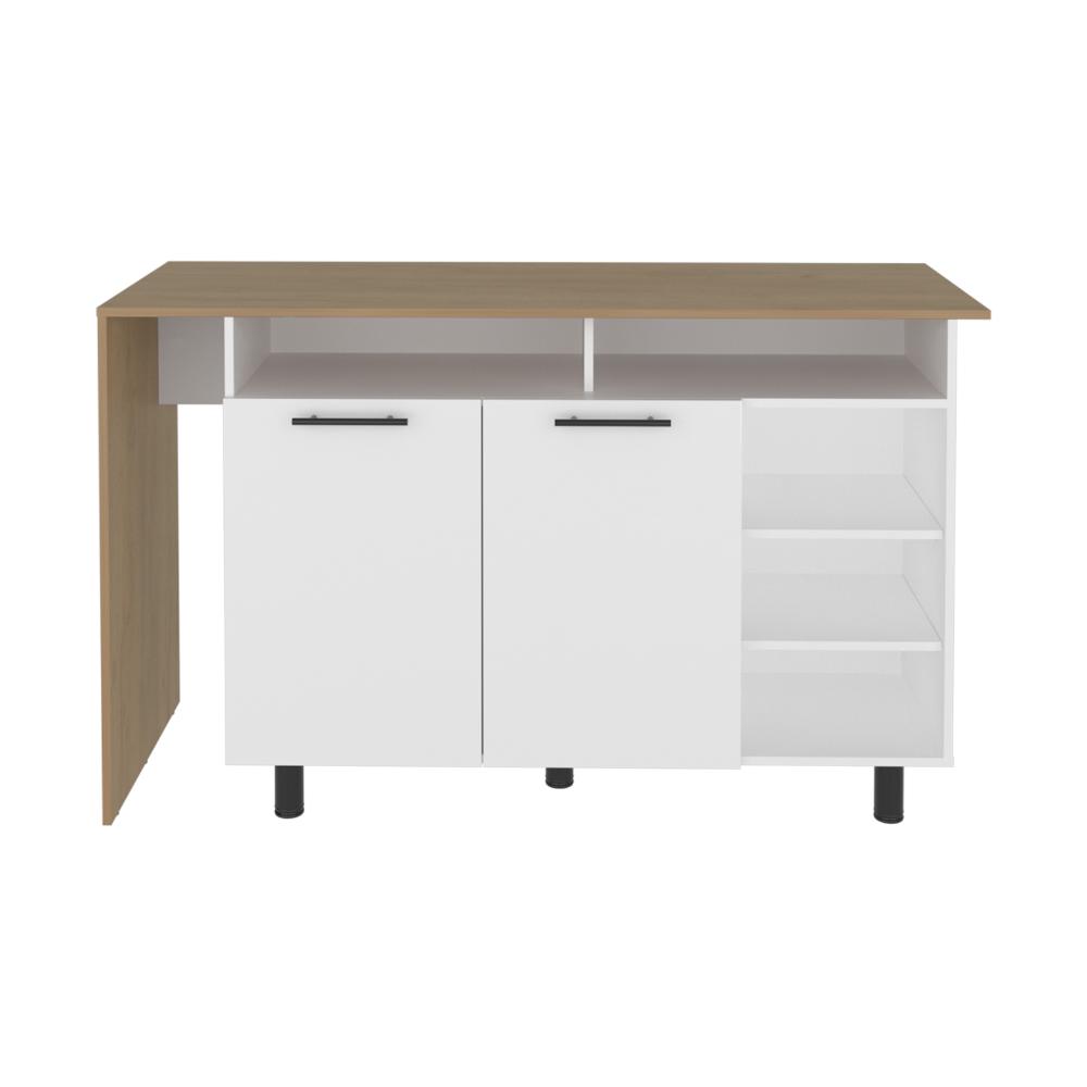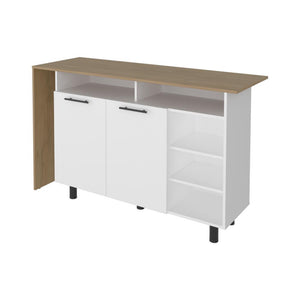 Barra de cocina, con amplia superficie en la mesa, 2 puertas abatibles y entrepaños para ubicar botellas, copas y otros elementos.