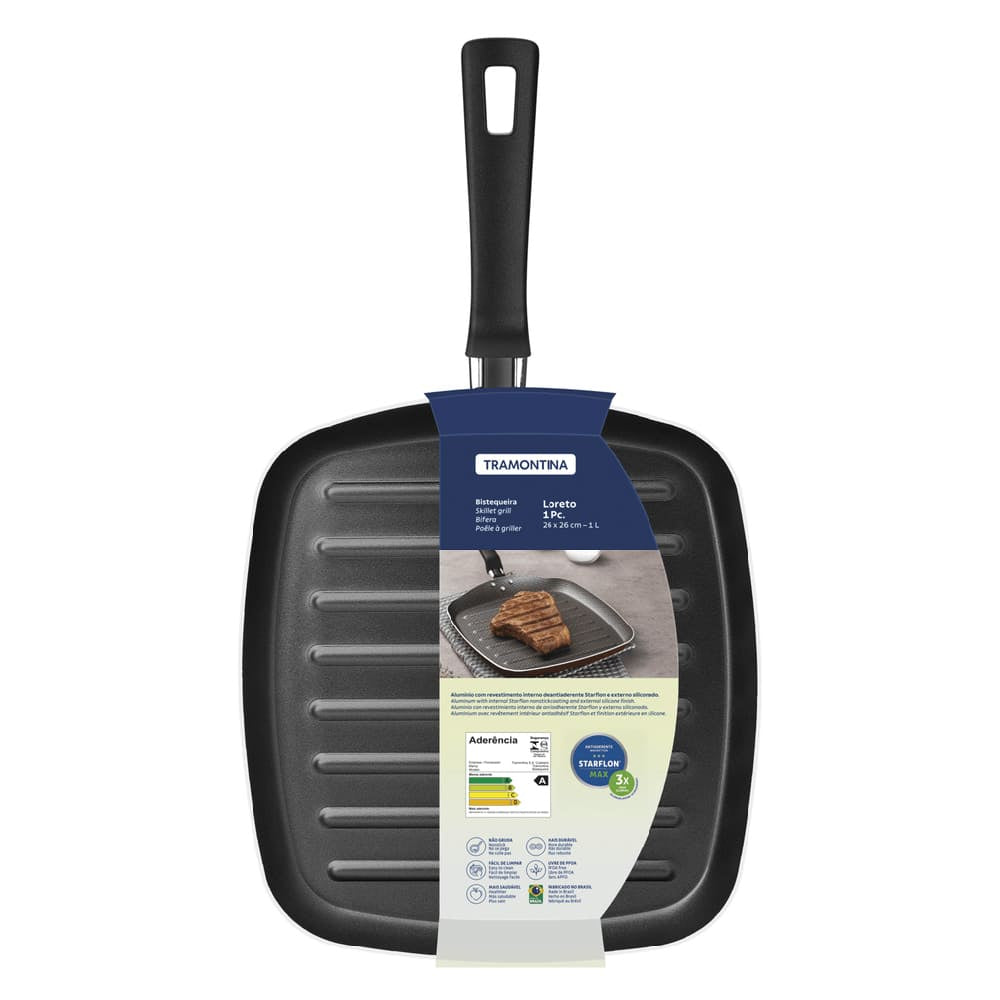 Para quienes les gusta preparar carnes, necesitan la bifera Tramontina Loreto en aluminio con revestimiento interno de antiadherente Starflon Max y mango de baquelita de 26 centímetros y 1,0 litros grafito. Perfecta para preparar filetes, bifes, bistecs, carnes de pollo, cerdo y pescado de la forma que prefieren, está producida en aluminio con revestimiento interno de antiadherente Starflon Max, posee un espesor que permite la cocción rápida y uniforme de los alimentos, más durabilidad y garantiza facilidad en la limpieza. Esto se debe a que el revestimiento evita que los alimentos se peguen en la superficie. Para su seguridad, el mango está fabricado en baquelita antitérmica. Es una pieza resistente, durable y muy fácil de limpiar. ¡Además, cuenta con surcos que les ofrecerán esa marca suculenta a sus recetas!