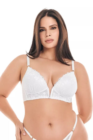 Brasier Vanessa, cubrimiento medio, realce medio. Elaborado en encaje y lycra. La copa triangular añade un toque delicado a tu estilo, mientras que el escote profundo en encaje proporciona un toque sensual y femenino. El posterior ancho asegura un excelente cubrimiento en el contorno, evitando que se marquen rollitos no deseados. Las cargaderas con accesorios dorados son versátiles, permitiendo su uso convencional o cruzadas según tus preferencias.