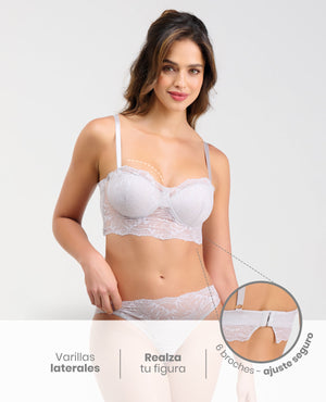 BRASIER MEDIA COPA DE REALCE MEDIO CON VARILLAS LATERALES PARA SOPORTE Y DEFINICIÓN. ENCAJE DELICADO PARA UN TOQUE SEDUCTOR. ESPALDA EN TUL CON REFUERZO EN POWERNET PARA MAYOR FIRMEZA. CARGADERAS AJUSTABLES Y ABROCHADURA DE 3 NIVELES CON 6 BROCHES PARA AJUSTE PERSONALIZADO