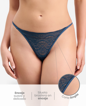 PANTY DE SILUETA BRASILERA EN ENCAJE, QUE APORTA UN DETALLE DELICADO Y FEMENINO. REFUERZO 100% ALGODÓN PARA MAYOR COMODIDAD.