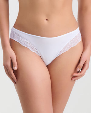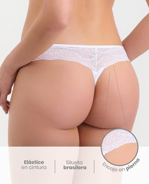 PANTY SILUETA BRASILERA SEMIDESCADERADA, CON DETALLES DE ENCAJE EN PIERNA. ELÁSTICO EN CINTURA PARA MEJOR AJUSTE. REFUERZO 100% ALGODÓN