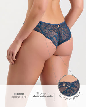 PANTY DE SILUETA CACHETERO EN ENCAJE Y TIRO SEMIDESCADERADO. CON UNA ABERTURA EN CINTURA EN LA PARTE POSTERIOR CON DETALLE DE ARGOLLA, QUE REVELA SUTILMENTE LA PIEL. INCLUYE REFUERZO 100% ALGODÓN PARA MAYOR COMODIDAD