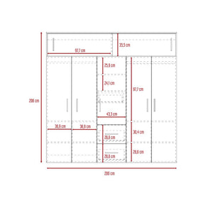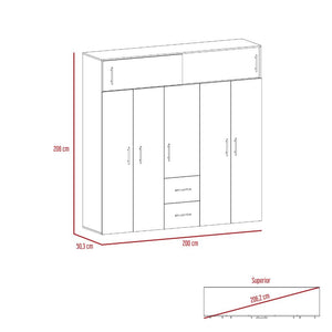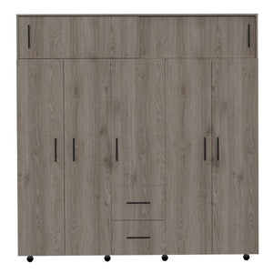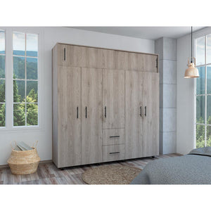 Closet, con 3 cajones organizadores, 5 puertas batientes, 2 puertas corredizas, variedad de entrepaños, y rodachines para su fácil desplazamiento.