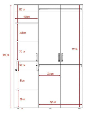 Closet, con 3 puertas con cerradura, dos tubos, amplios espacios para guardar ropa, y un cajón organizador.