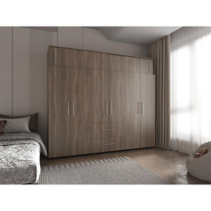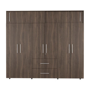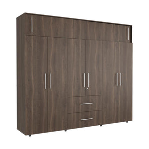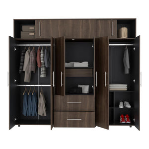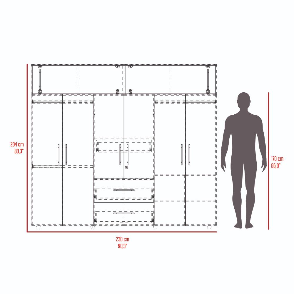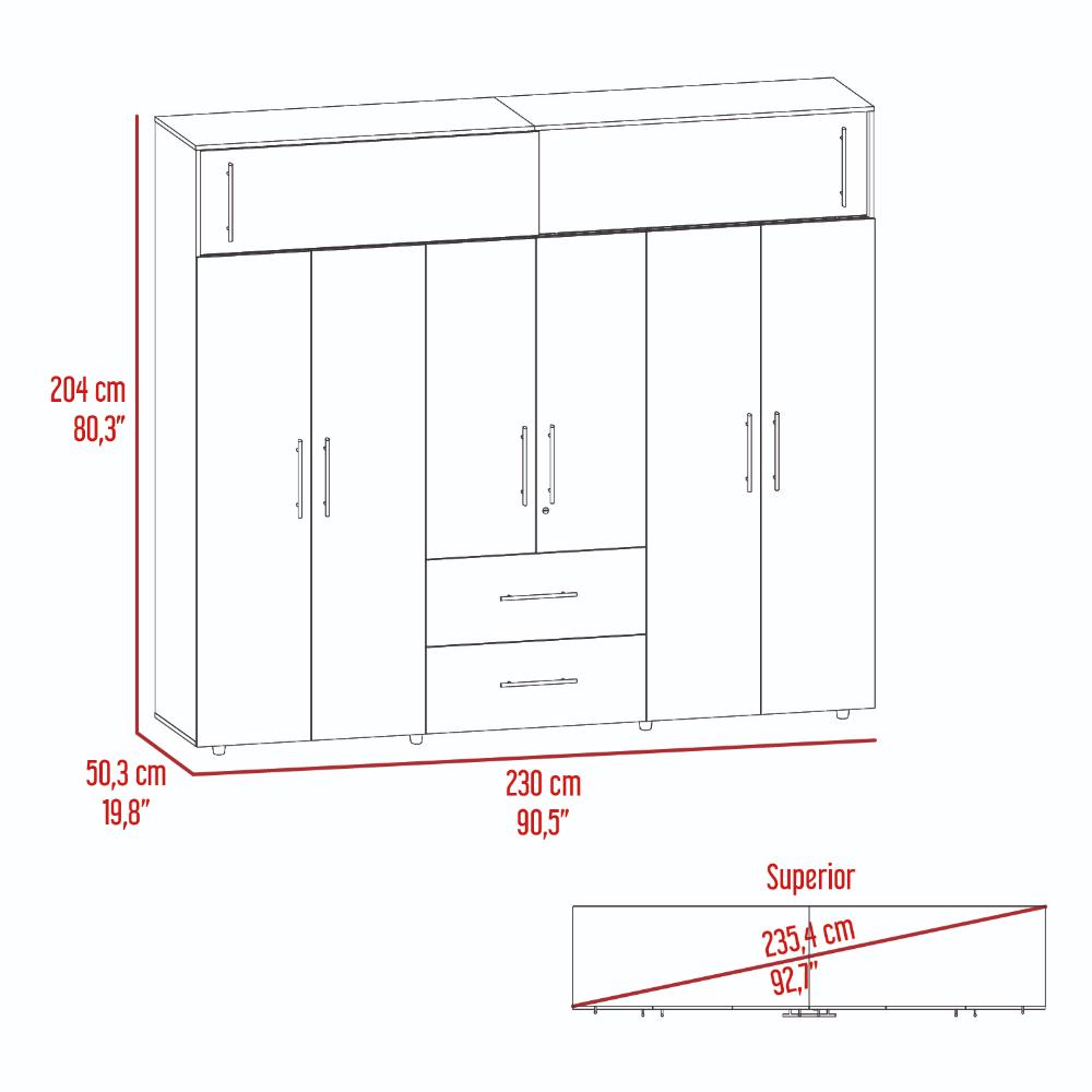 Closet, con seis puertas abatibles, tres tubos ovalados para colgar ropa, dos cajones organizadores multiusos, dos puertas corredizas.