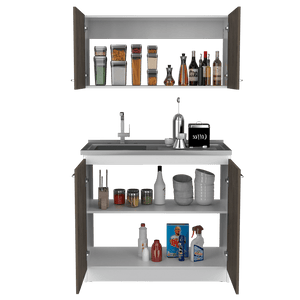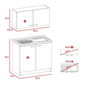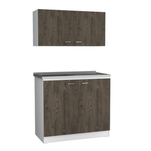 Cocina Integral Pequeña, con mesón, 4 puertas abatibles, 3 entrepaños y manijas metálicas.