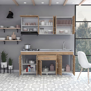 cocina integral carson, miel y blanco, incluye mesón derecho en acero inoxidable