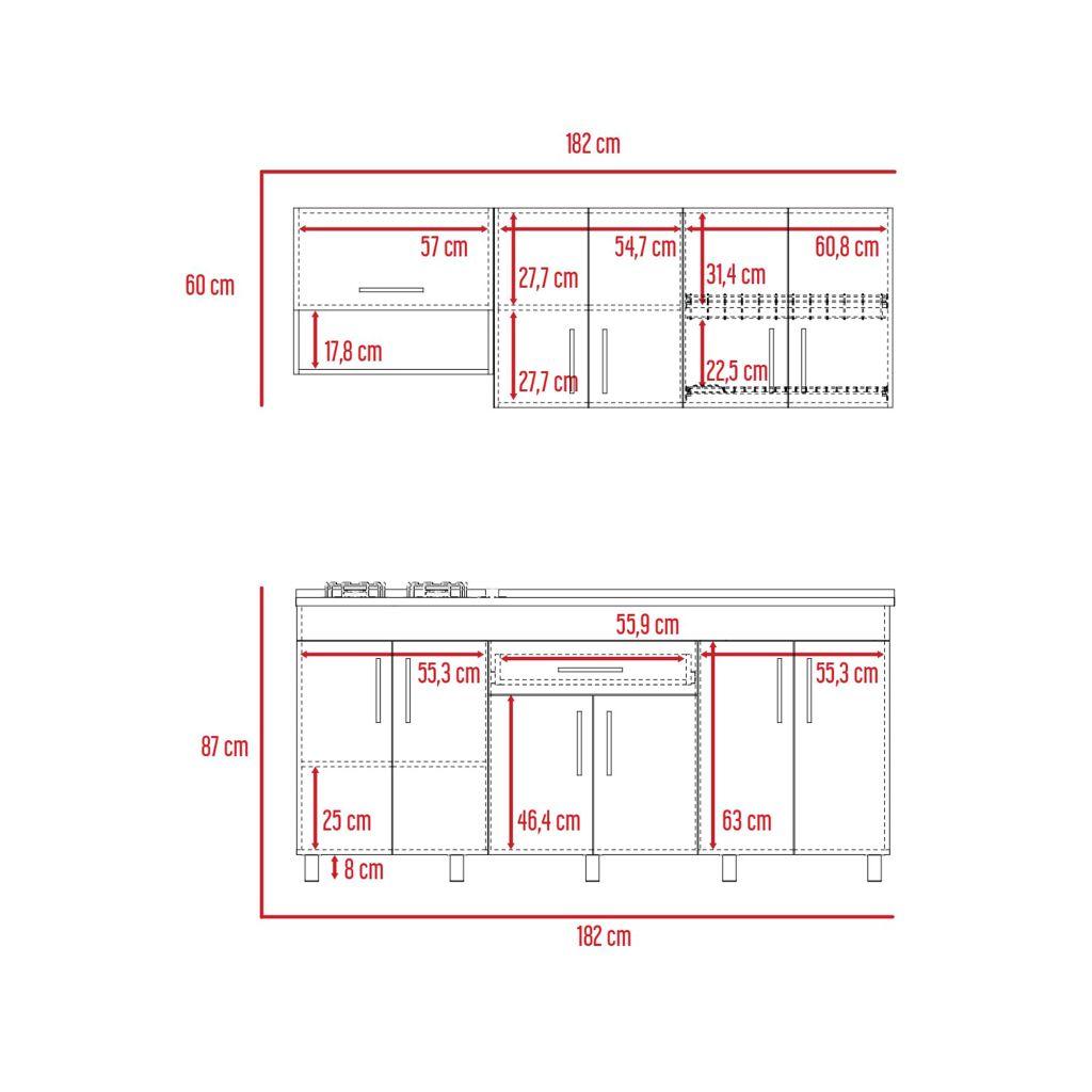Manijas metálicas, 5 puertas abatibles, amplios espacios para guardar utensilios de cocina, alimentos u otros, espacios para colocar objetos decorativos, incluye locero y portavasos,