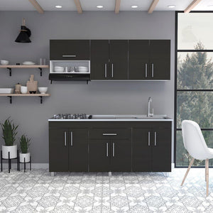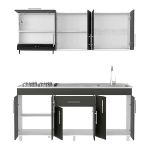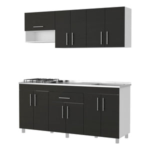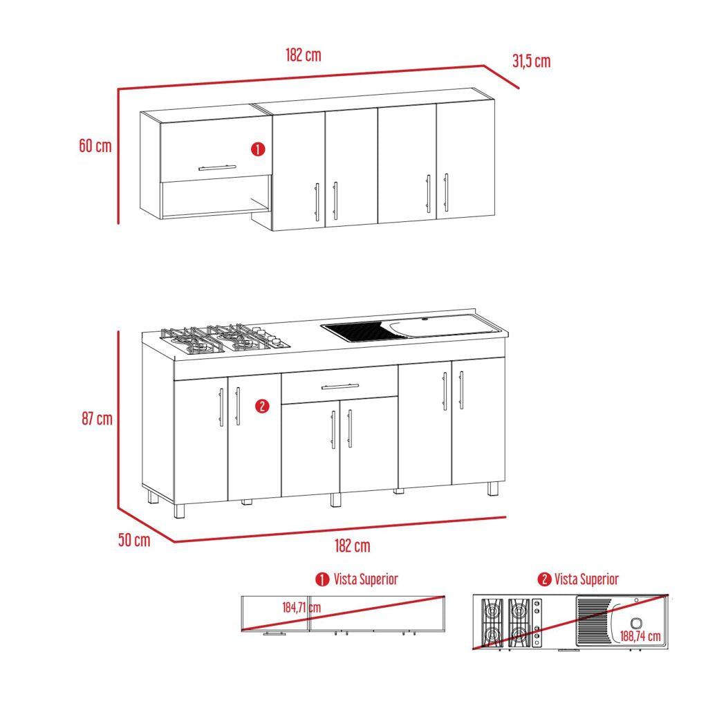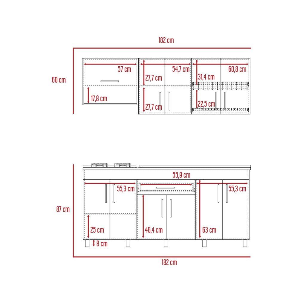 Cocina Integral, con 1 cajón con riel extensión total, 11 puertas batientes, incluye locero y portavasos, módulo para campana extractora de 60 cm, incluye mesón derecho, múltiples entrepaños y superficies para ubicar objetos.