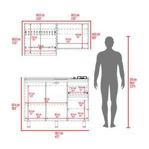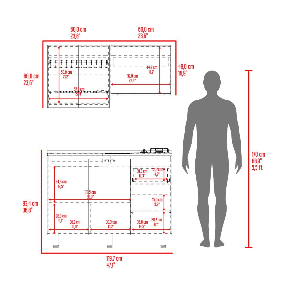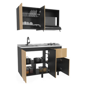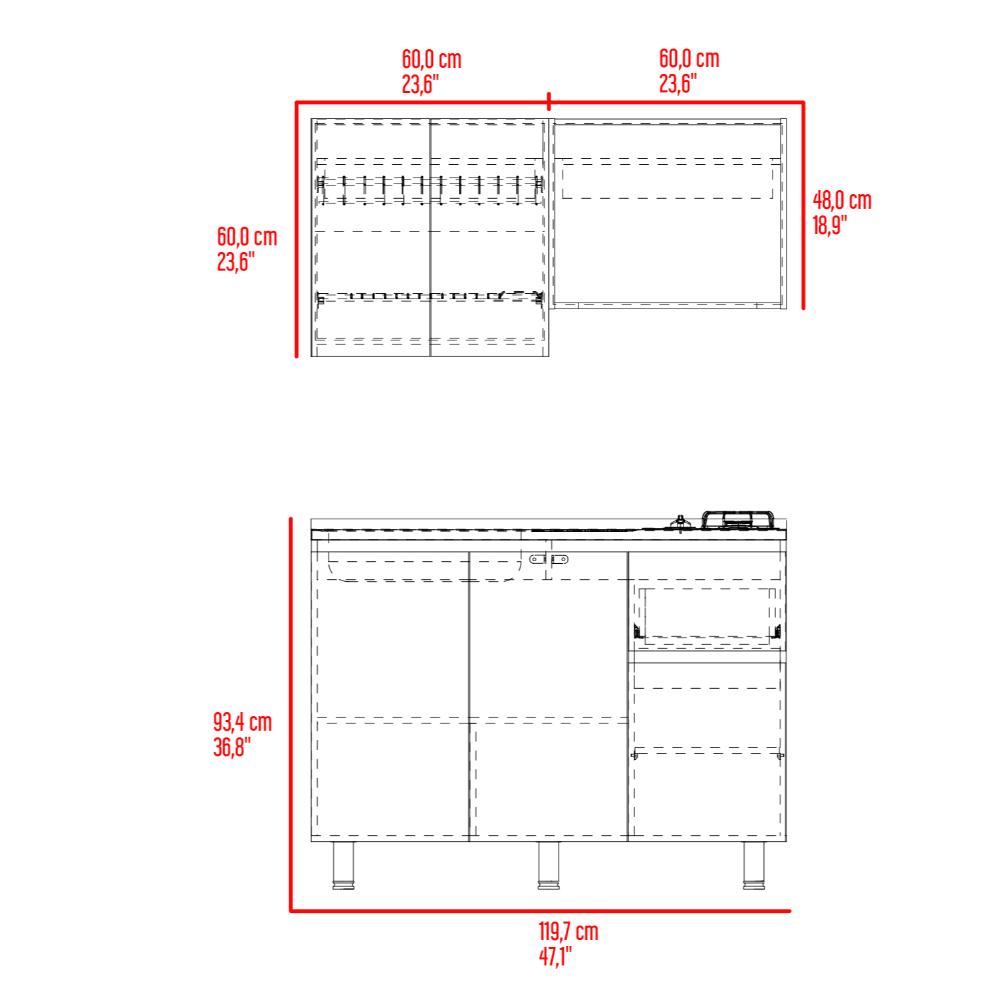 Cocina Integral 1,20, Incluye mesón izquierdo con diseño moderno, combinación de colores, múltiples entrepaños para ubicar objetos y puertas batientes