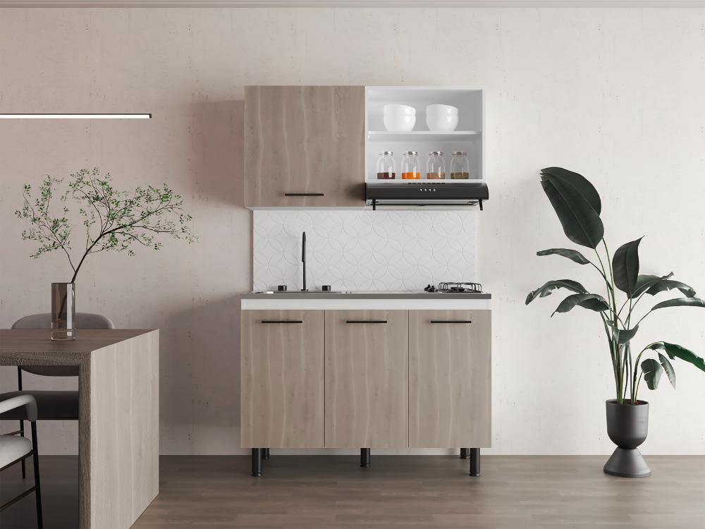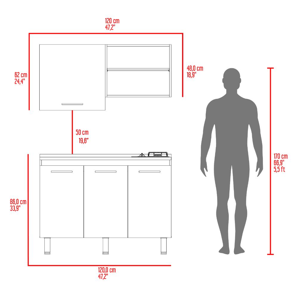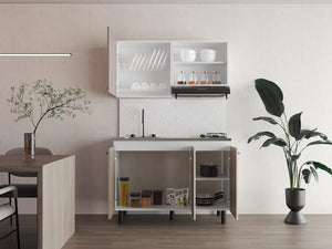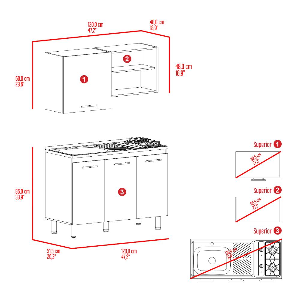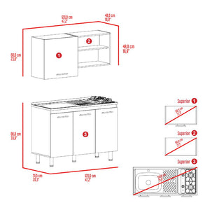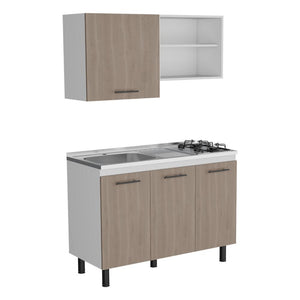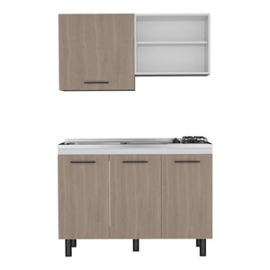 Cocina Integral, incluye mesón izquierdo liso, 6 puertas batientes, patas metálicas, variedad de entrepaños.