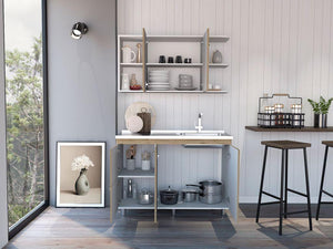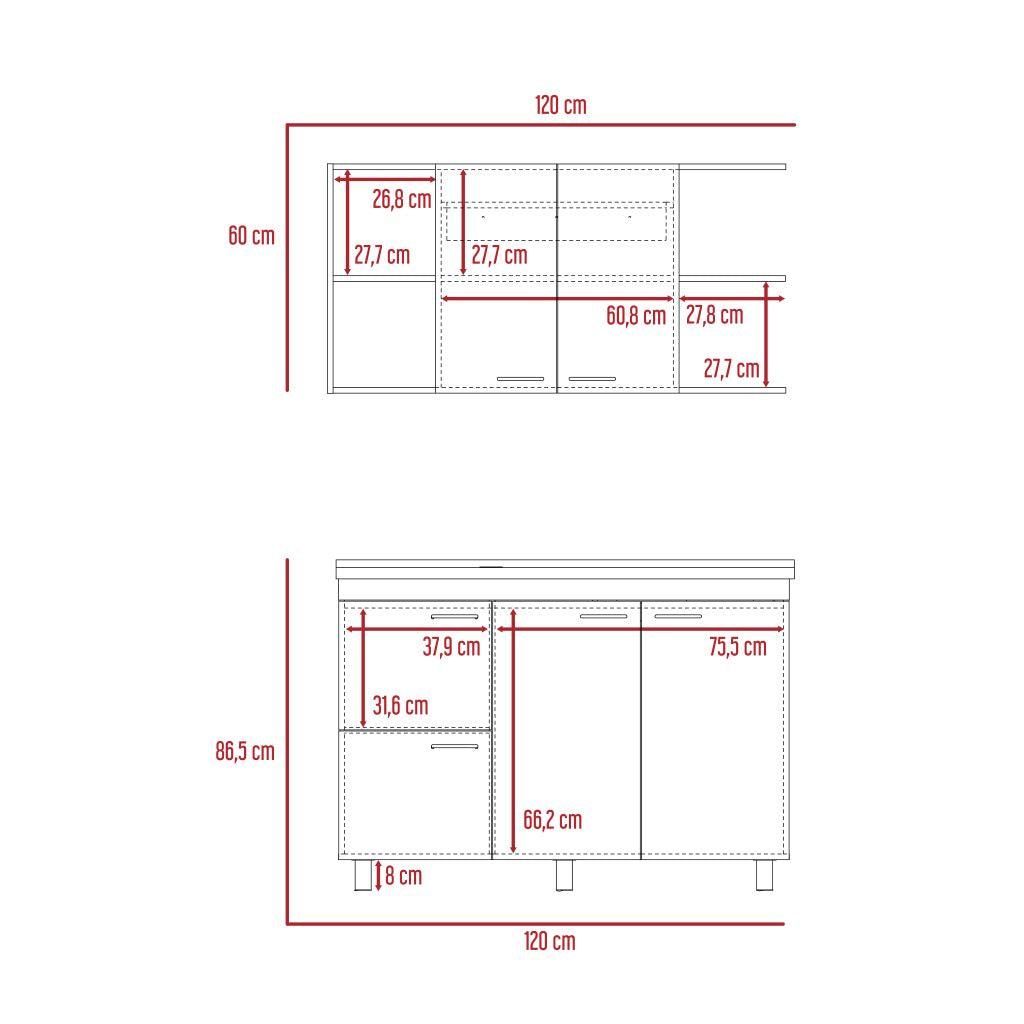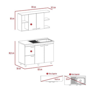 Cocina Integral, incluye mesón derecho liso, 6 puertas batientes, patas metálicas, variedad de entrepaños.