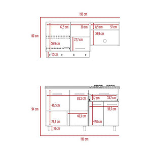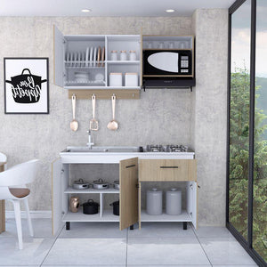 Cocina Integral, incluye mesón izquierdo, con 6 puertas batientes, 1 cajón, patas metálicas, manijas metálicas, incluye locero, espacio para campana extractora de 60 cm.