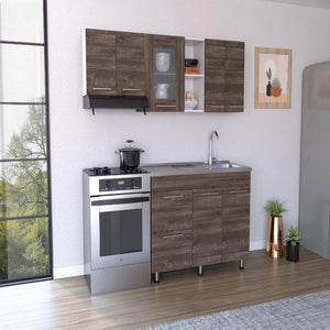 Cocina integral , con puertas batientes , incluye mesón derecho, múltiples entrepaños y superficies para ubicar objetos.