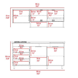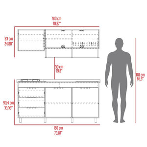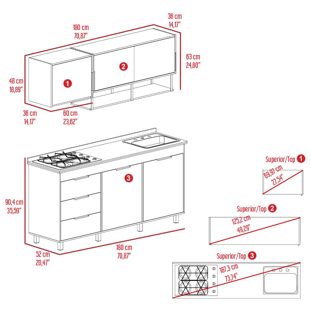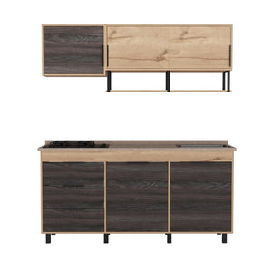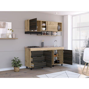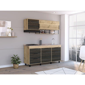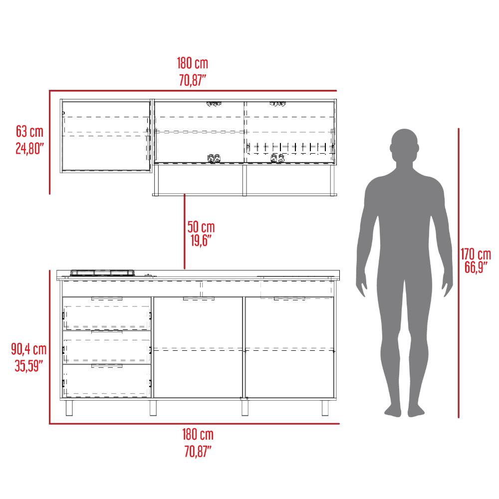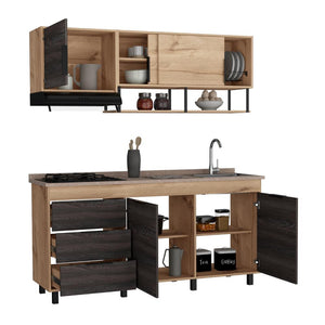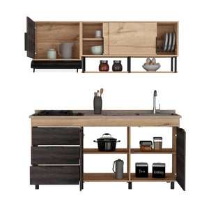 Cocina Integral, con 1 cajón deslizable, variedad de entrepaños, espacio para estufa, 6 puertas batientes, 2 puertas abatibles, manijas y patas metálicas.