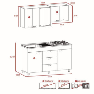 Cocina Integral, incluye mesón con pozuelo a la izquierdo, 7 puertas batientes, 3 cajones, manijas metálicas, y variedad de entrepaños.