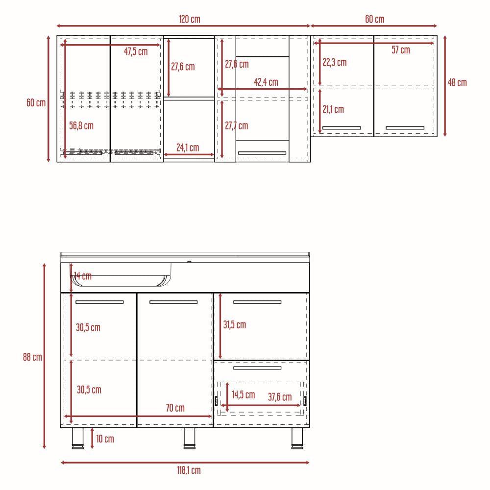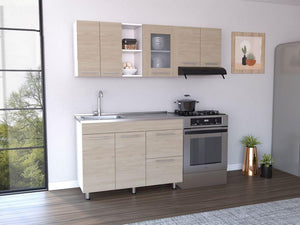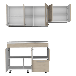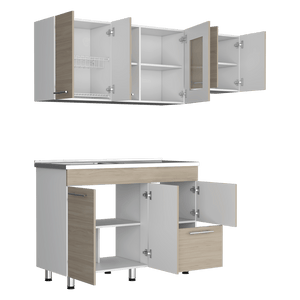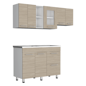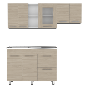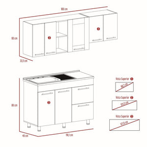 Cocina Integral , incluye Mesón Izquierdo, 8 puertas, 1 cajones deslizables, variedad de entrepaños, manijas y patas metálicas.