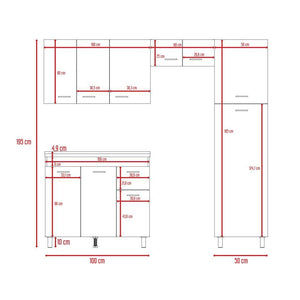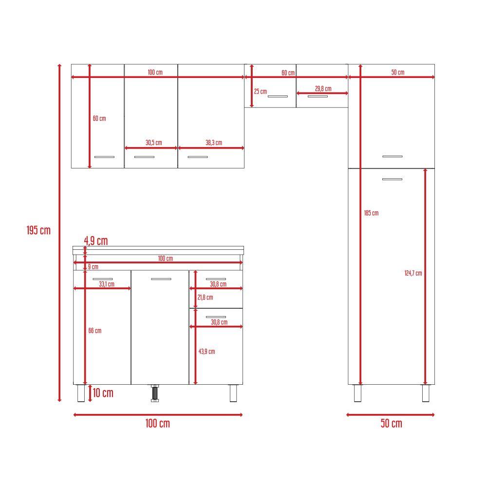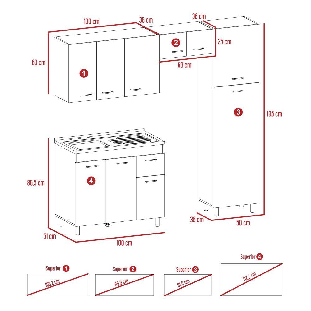-Módulo Inferior: manijas metálicas, 3 puertas abatibles, amplios espacios para guardar alimentos, utensilios de cocina u otros, y 1 cajón organizador con rieles de extensión total.