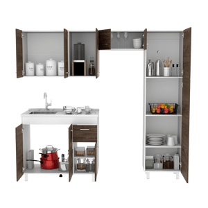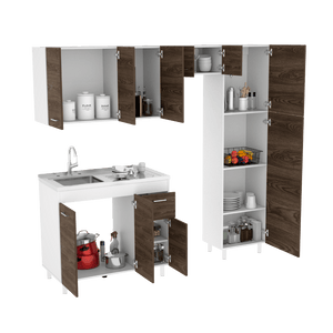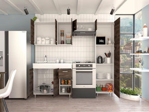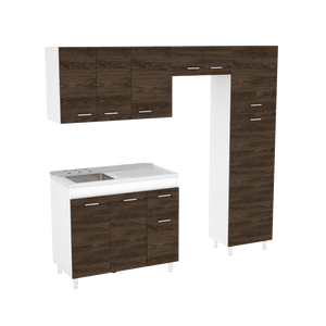 cocina integral mercy, chocolate y blanco, incluye mesón con pozuelo a la izquierda