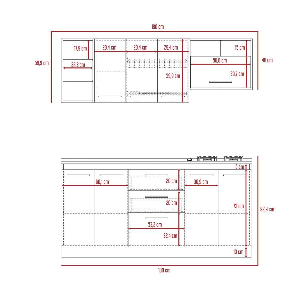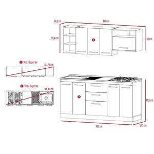 Cocina Integral, con 2 cajones organizadores, 9 puertas batientes, manijas metálicas, incluye porta locero, mesón con pozuelo a la izquierda, y variedad de entrepaños.