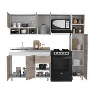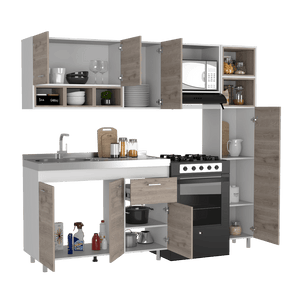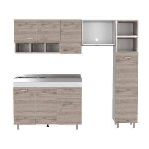 Cocina Integral, con 7 puertas batientes, 1 cajón, patas metálicas, manijas metálicas, incluye Locero, espacio para campana extractora de 60 cm, y, 5 entrepaños. Incluye mesón izquierdo en acero inoxidable.