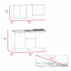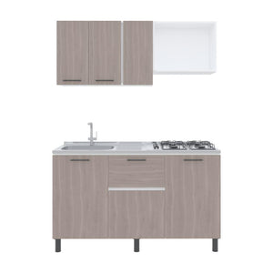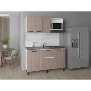 Cocina Integral, con Mueble Superior que incluye locero y portavasos, tres puertas abatibles, espacio para campana extractora. Mueble Inferior sirve para meson Izquierdo, tres puertas abatibles, manijas en acero