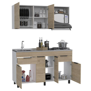 Cocina Integral, con 3 cajón, 8 puertas abatibles, espacio para campana extractora, patas metálicas y manijas metálicas.