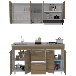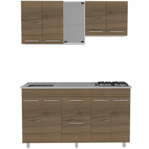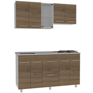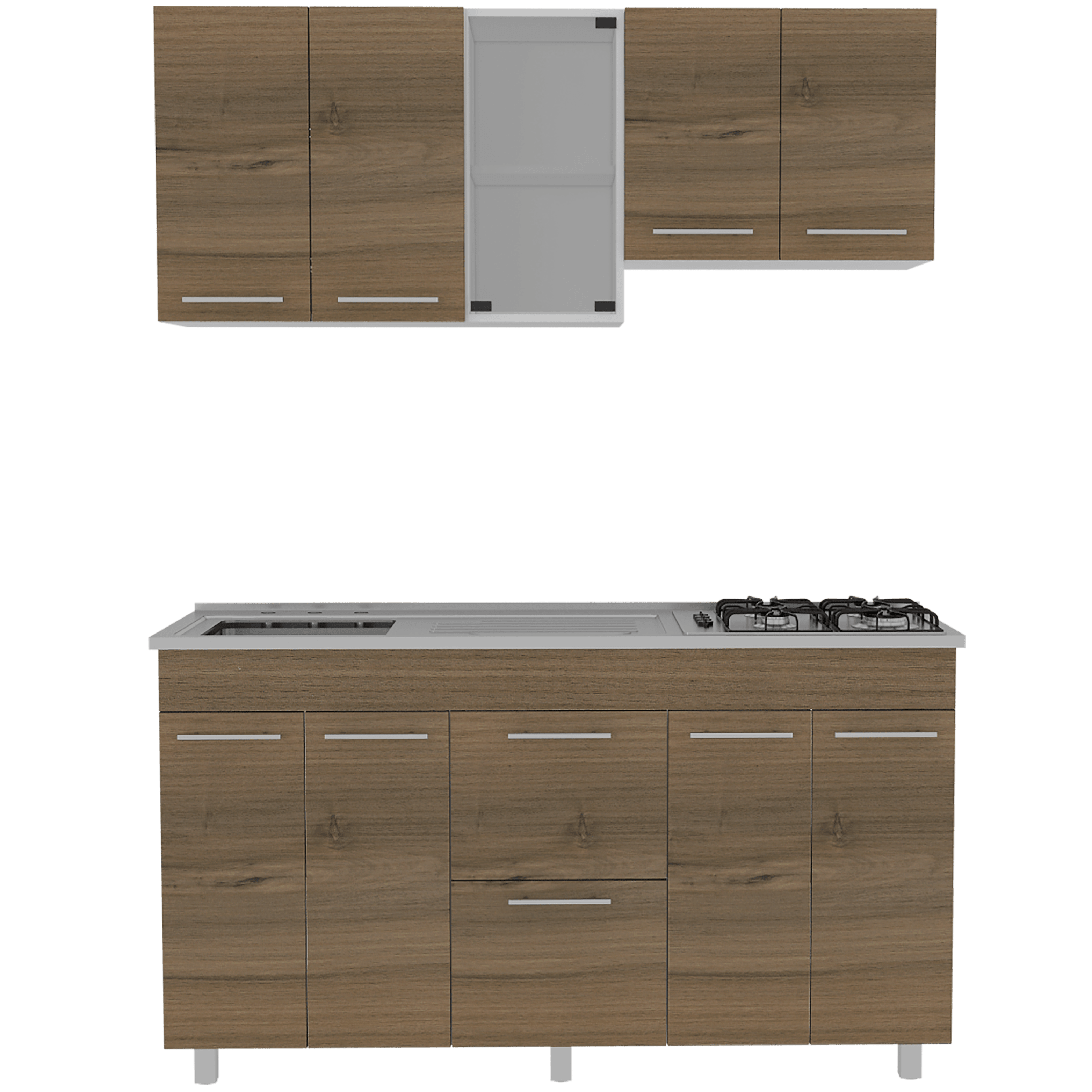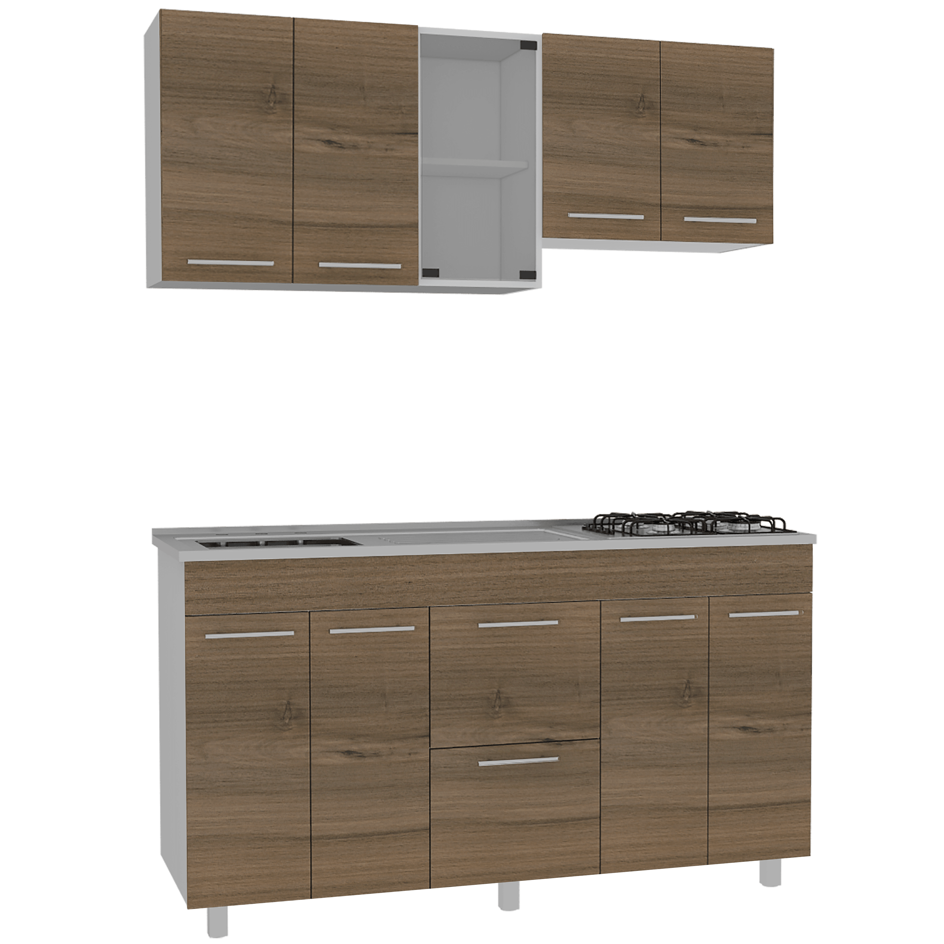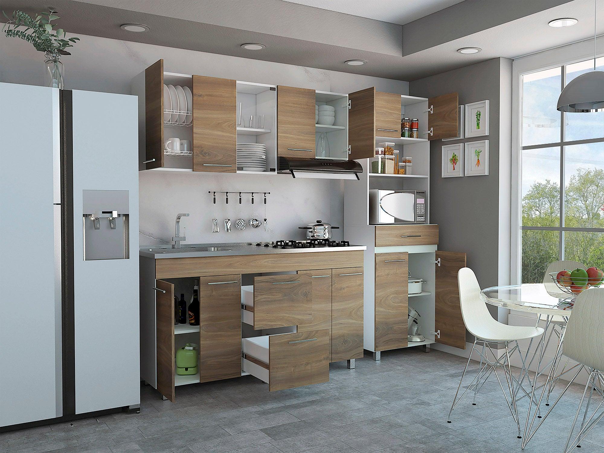 Cocina Integral, con manijas metálicas, incluye locero y portavasos para vajilla, modulo para campaña extractora de 60, Incluye mesón Izquierdo. El mueble inferior incluye 2 cajones organizadores centrales, 4 puertas abatibles y amplios espacios para guardar alimentos, electrodomésticos u otros.