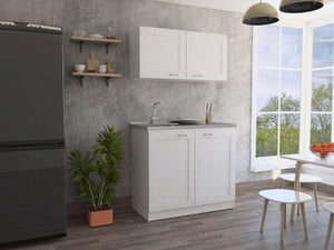 Cocina Integral, con mesón en acero inoxidable, cuatro puertas batientes, y manijas metálicas. Incluye mesón izquierdo.