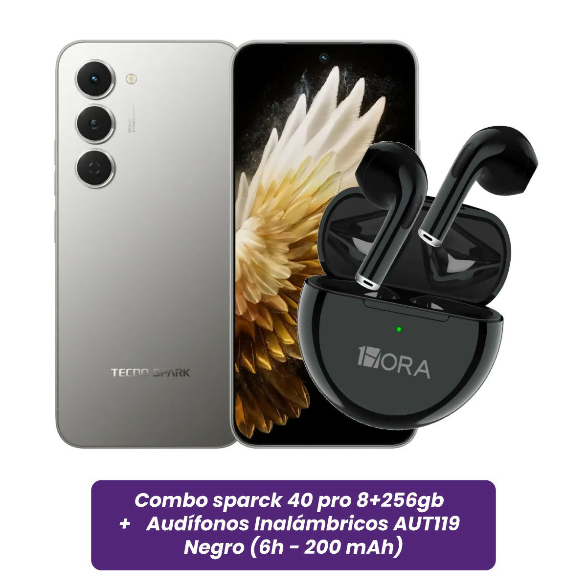 COMBO CELULAR TECNO SPARK 40 PRO 8+256GB + AUDÍFONOS 1HORA INALÁMBRICOS AUT119 NEGRO