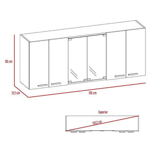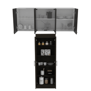 Combo cocina, con gabinete superior de amplios espacios para guardar utensilios de cocina o alimentos, cuatro puertas abatibles, manijas metálicas, entrepaño móvil central y dos puertas centrales de vidrio, con alacena de cinco entrepaños y dos puertas batientes