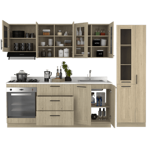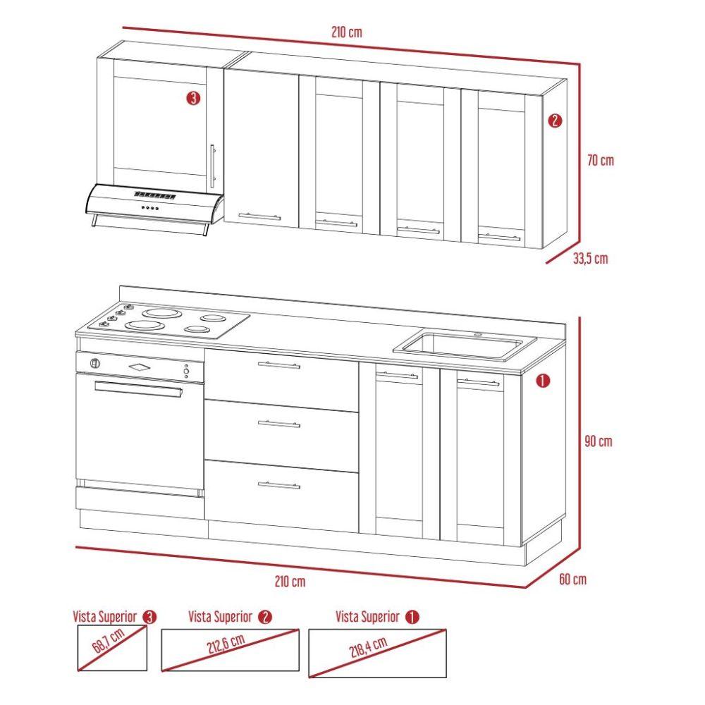 - Cocina Integral Completa, con 3 cajones y 7 puertas batientes. Incluye mesón derecho compuesto por acrílico y minerales; lavaplatos; estufa 4 puestos a gas; campana extractora HACEB, cubierta y horno HACEB.