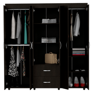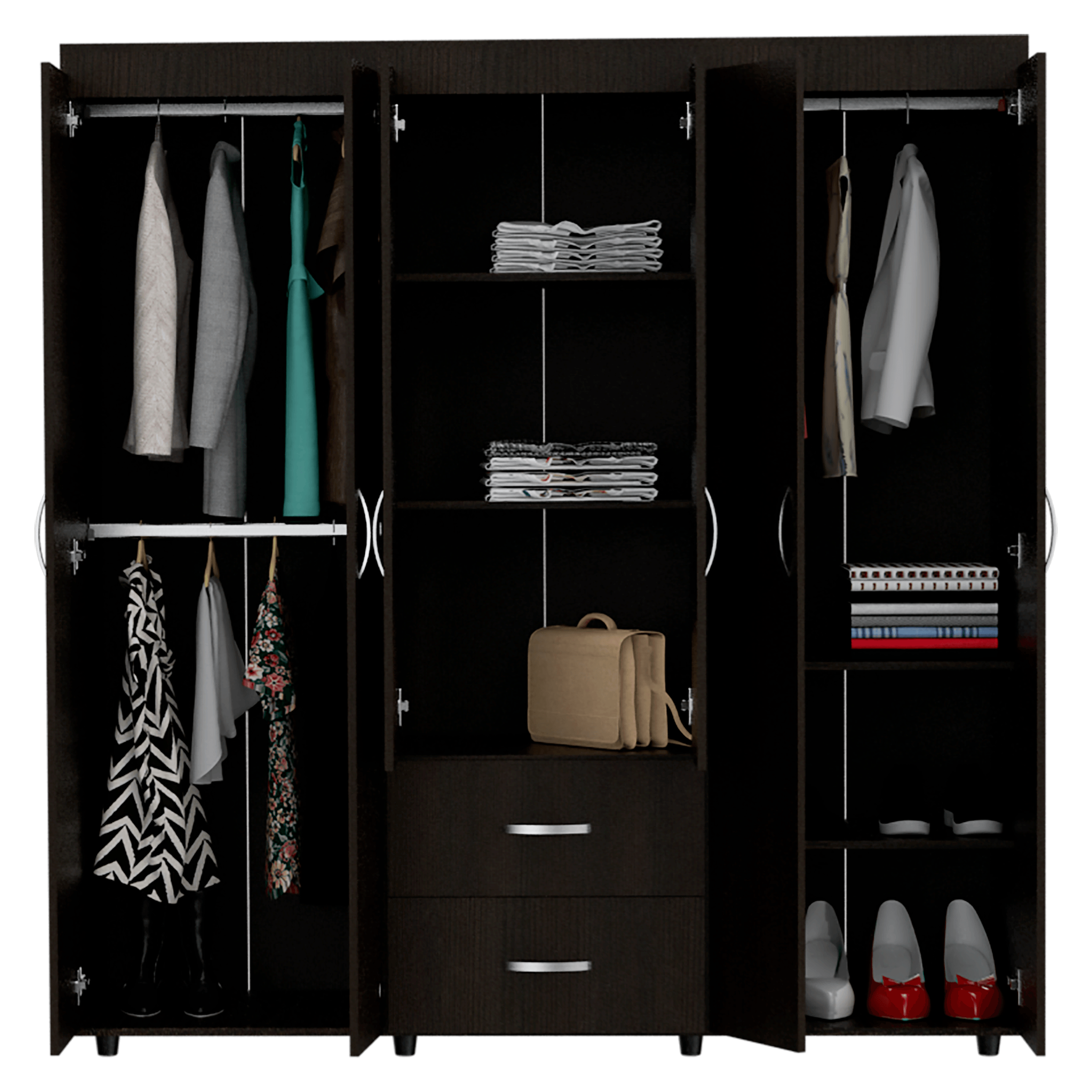 Closet, con amplios espacios y entrepaños para organizar, 6 puertas abatibles, 3 tubos cromados, 2 cajones organizadores, y deslizadores de plástico para apoyo al piso.