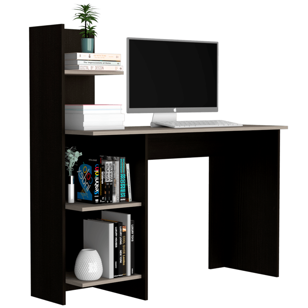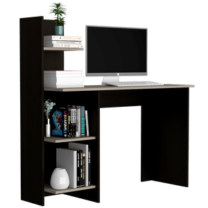 Escritorio, con amplia superficie de trabajo, entrepaños para ubicar libros y/o elementos decorativos, combinación de colores.