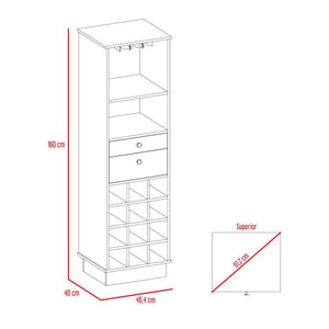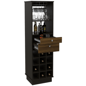 Bar, con dos cajones deslizables, botellero, copero, entrepaños para colocar objetos y patas metálicas.