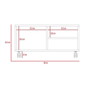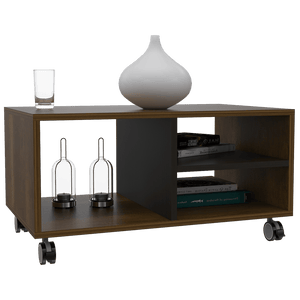Mesa de centro, con varios entrepaños para colocar objetos y rodachines para su fácil desplazamiento.