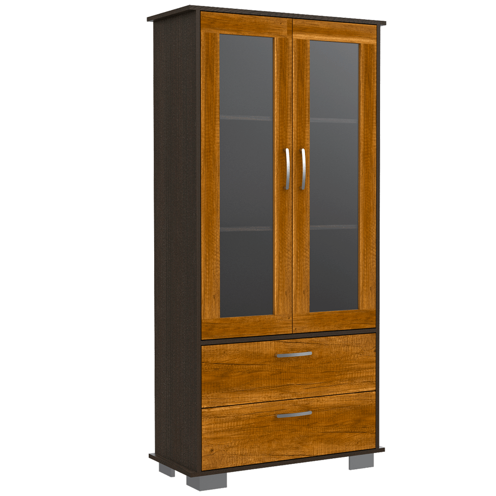 Vitrina, con 2 cajones y 2 puertas batientes con manija, con múltiples entrepaños para colocar objetos, de fácil armado e instalación.