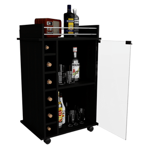 Bar, con 1 puerta batiente de vidrio, rodachines, espacio para porta botellas y copas.