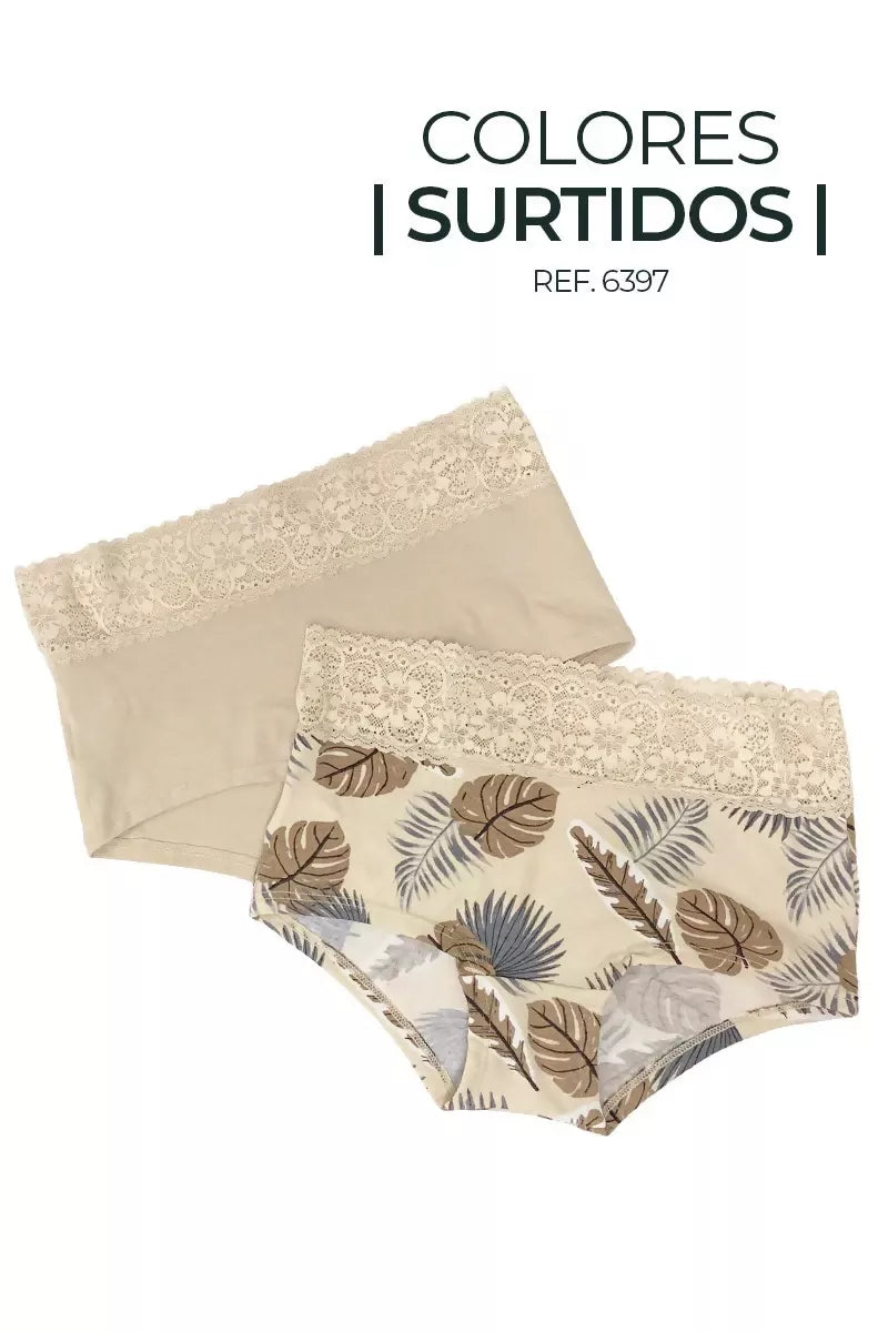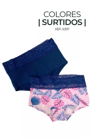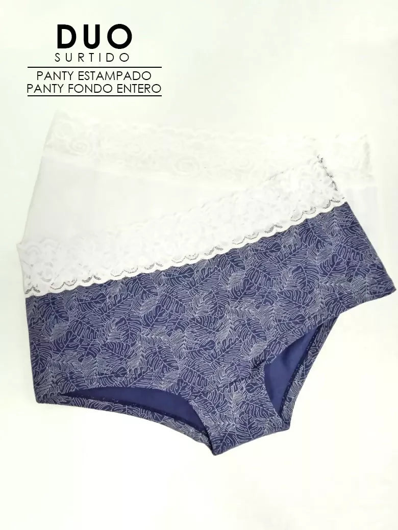 Duo de Pantys Vanessa en algodón, tipo cachetero, con encaje en cintura, te llegara en color SURTIDO y estampado SORPRESA, uno estampado y el otro fondo entero (foto de posibles opciones de color) REFERENCIA: L6397