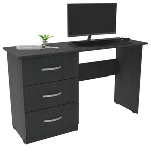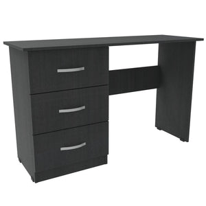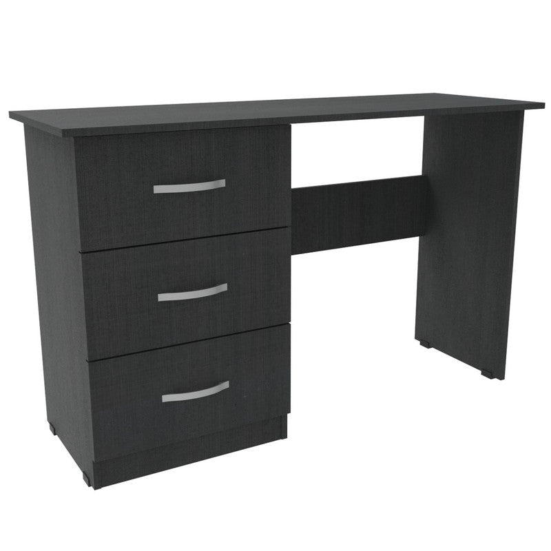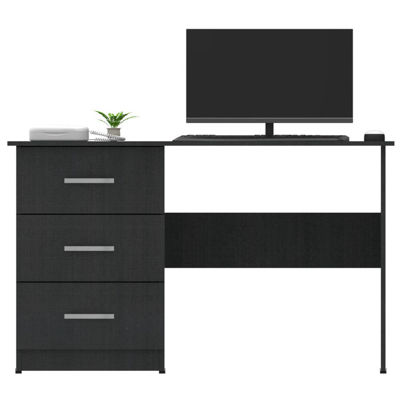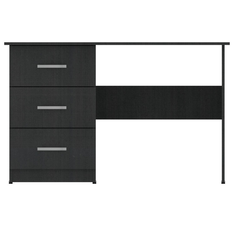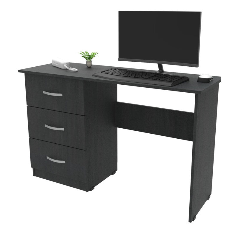 Este escritorio es diseñado para cualquier tipo de ambiente, su cubierta tiene un espacio muy amplio, la cubierta es elaborada con tablero aglomerado de 33 mm recubierto de melamina La estructura que soporta el escritorio es metálica en color negro, elaborada con tubería rectangular, con un acabado superficial de pintura electrostática color negro micro texturizado y en su base tapones plásticos o niveladores de tornillo, que evitan rayones en las superficies.