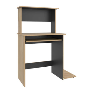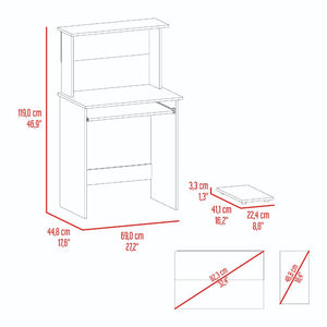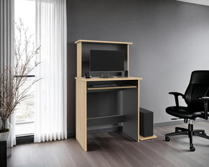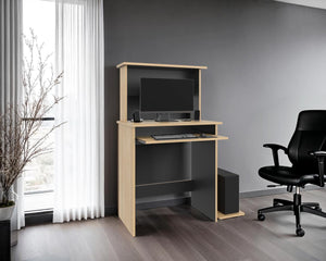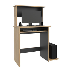 Escritorio, para PC con pantalla hasta 19”, porta teclado con rieles metálicos, espacio para objetos de entretenimiento y estudio y plataforma móvil para CPU.