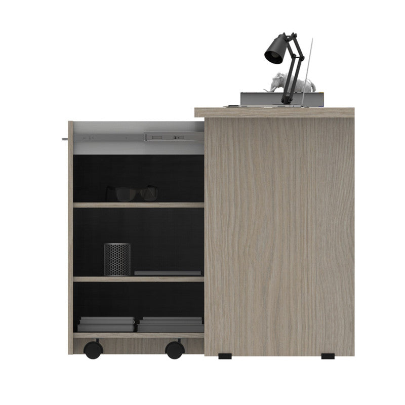 Este escritorio es diseñado para espacios de oficinas, su cubierta tiene un espacio muy amplio y cuenta con bandejas a los lados para ordenar mas objetos, la cubierta es elaborada con tablero aglomerado de 33 mm recubierto de melamina La estructura que soporta el escritorio es metálica color negra de 50×25 mm. Elaborada con tubería rectangular, con un acabado superficial de pintura electrostática color negro micro texturizado, y en su base tapones plásticos o niveladores de tornillo, que evitan rayones en las superficies.