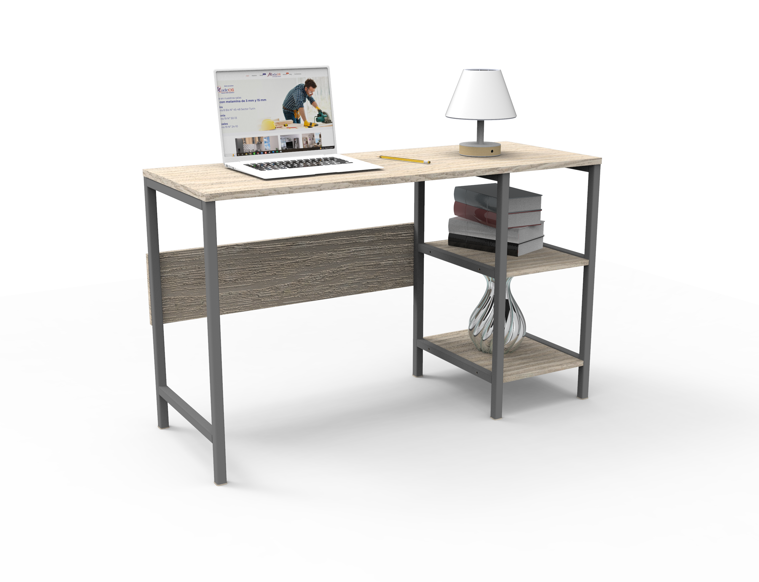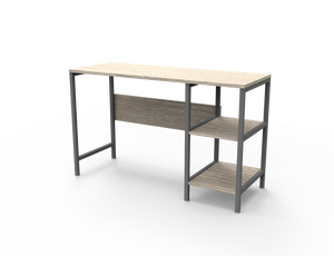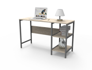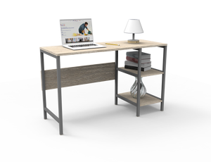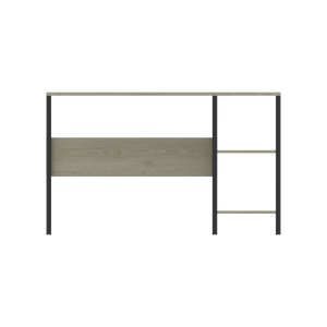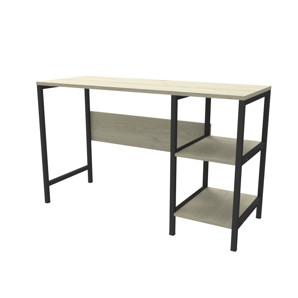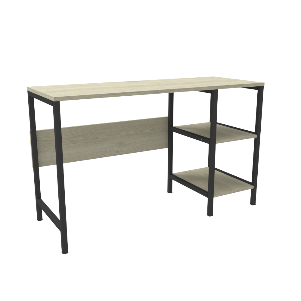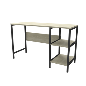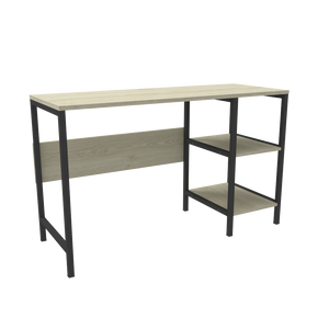 Escritorio con una superficie amplia con dos cajones organizadores con rieles, su diseño cuenta con la combinación de dos colores.