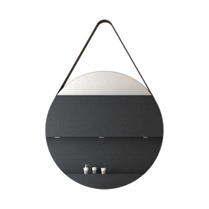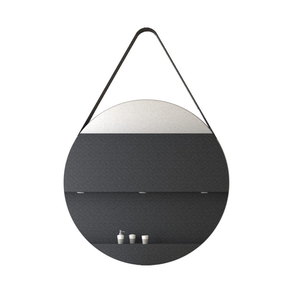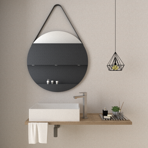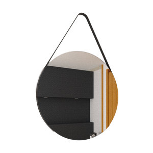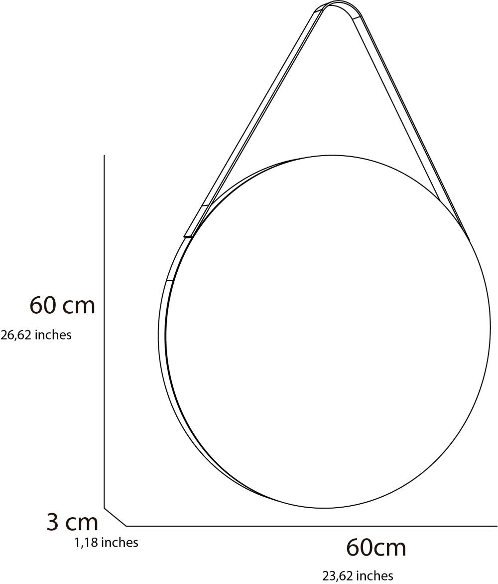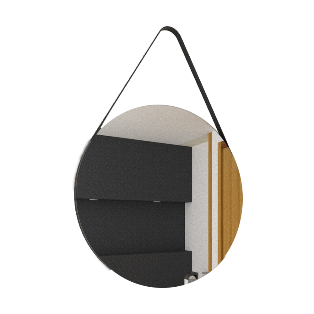 Espejo x2 circular con marco aglomerado mdp revestido en cuero y correa decorativa en cuero, ensamble a pared con chaflan. Incluye herrajes para su instalación.