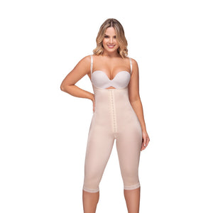 Faja a la rodilla de compresión media con efecto soft, ideal para uso diario, postparto y fases posteriores del postquirúrgico. Brinda control abdominal suave, moldea la figura sin presión excesiva y permite libertad de movimiento. Diseño con busto libre, tirantes ajustables, cobertura media en espalda, dos niveles de broches y cierre perineal funcional. Confeccionada en tela bidireccional que se adapta al cuerpo sin marcar la piel.