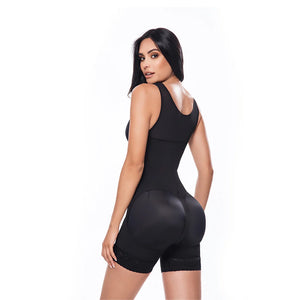Faja tipo body de alta compresión con media pierna, brasier integrado y manga sisa. Ideal para uso postquirúrgico, postparto y diario. Su diseño con espalda alta mejora la postura y ofrece control en abdomen, cintura, muslos y glúteos. Cuenta con broches frontales de dos niveles y cierre perineal para mayor comodidad.