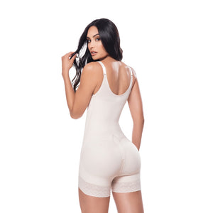 Faja a media pierna de alta compresión, ideal para postquirúrgico, postparto y uso diario. Brinda control en abdomen, cintura, espalda, muslos y realce natural de glúteo tipo plus. Diseño con busto libre, tirantes ajustables, cobertura media en espalda, 2 niveles de broches frontales, cierre perineal y refuerzo abdominal. Confeccionada en powernet con forro suave.